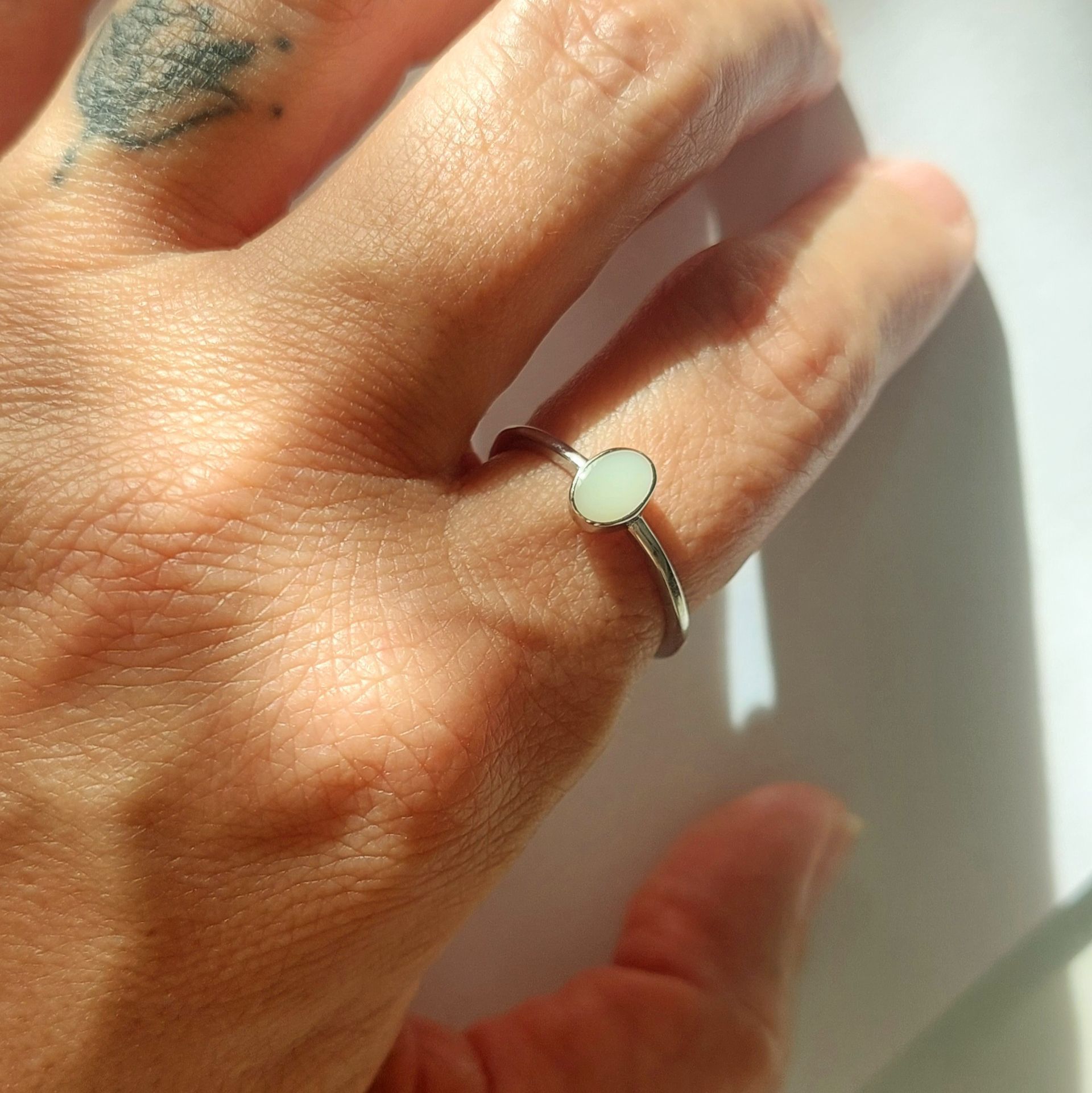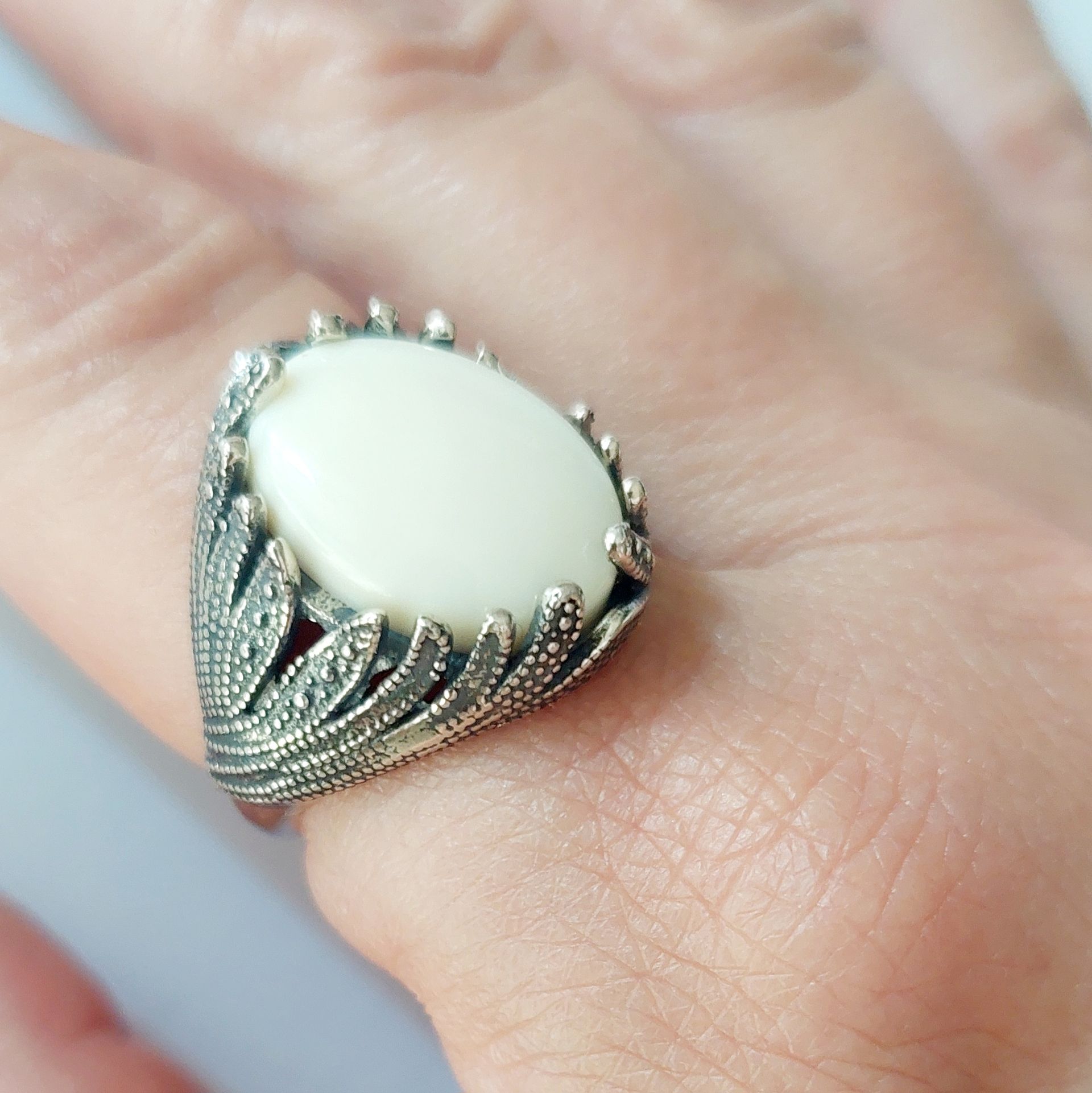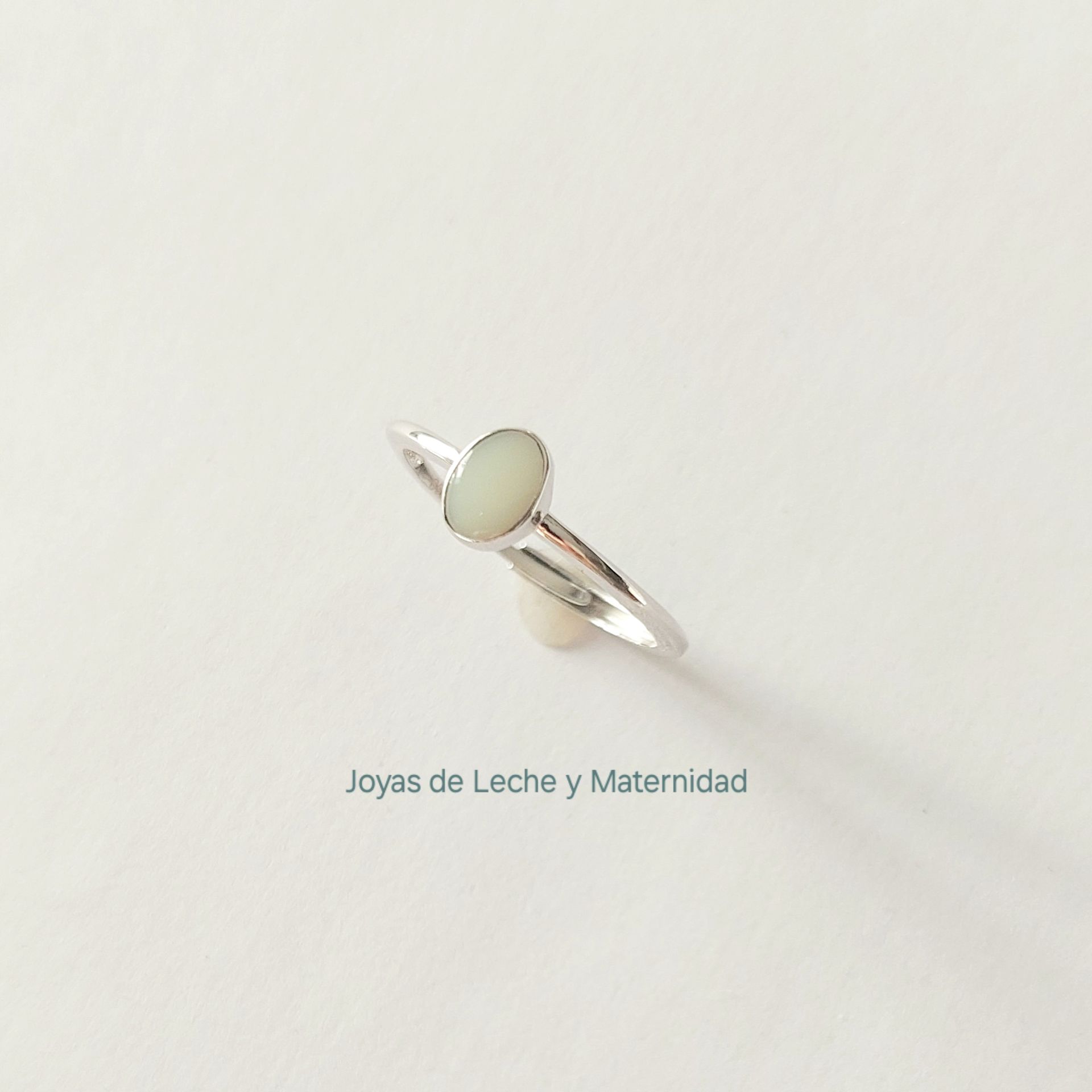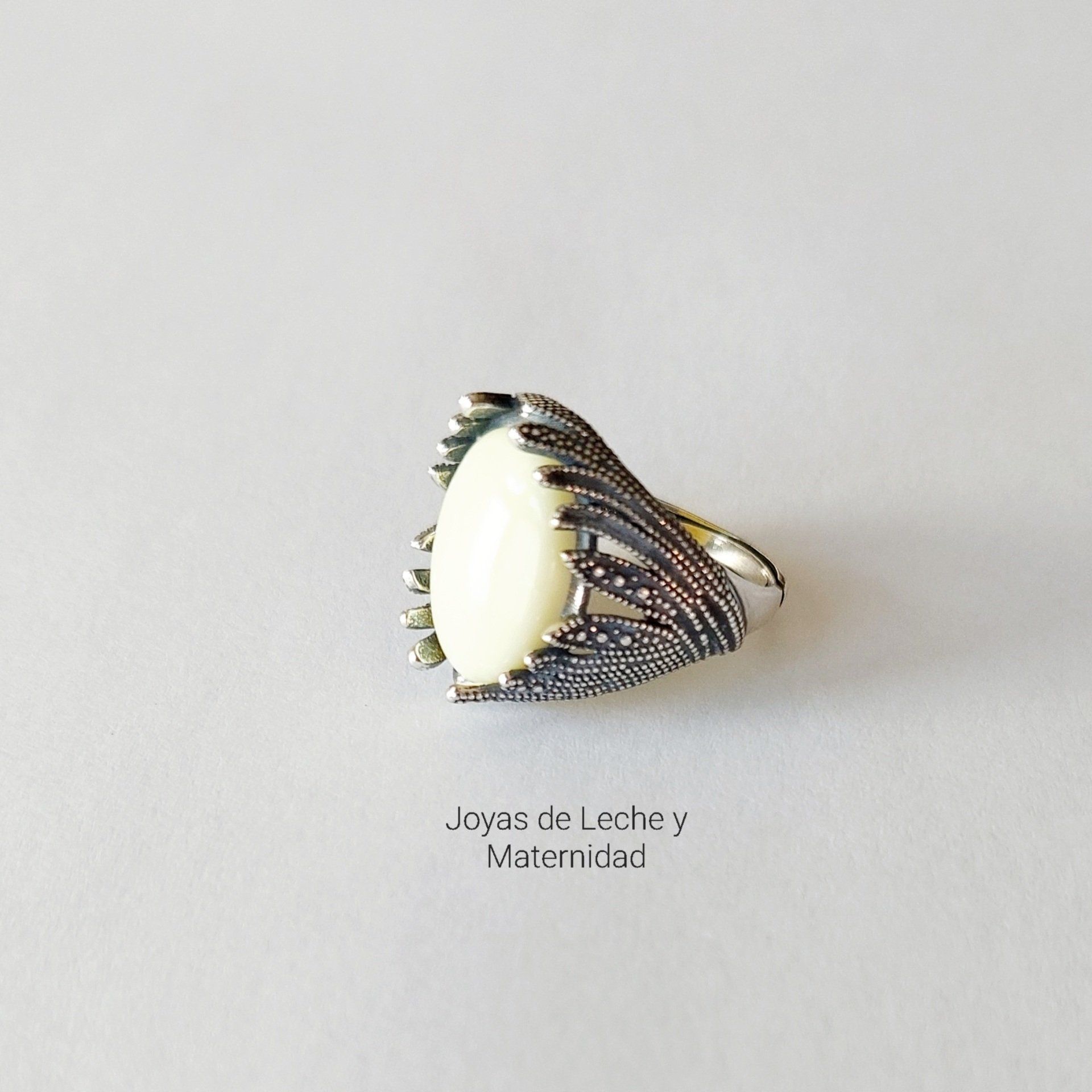 Piedra oval de leche materna, en un importante anillo con cabujón en plata vieja de Primera Ley de 19,2x16,8mm. Anillo en medida regulable pero no adaptable a tallas muy pequeñas.